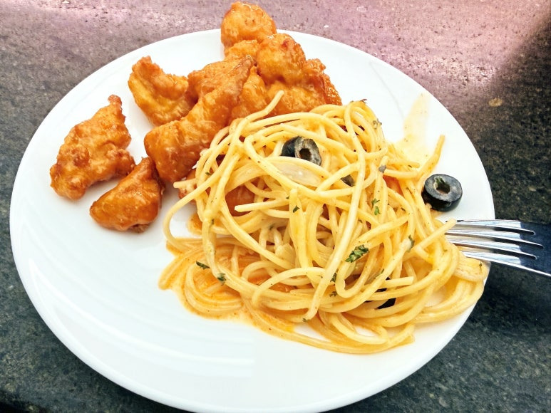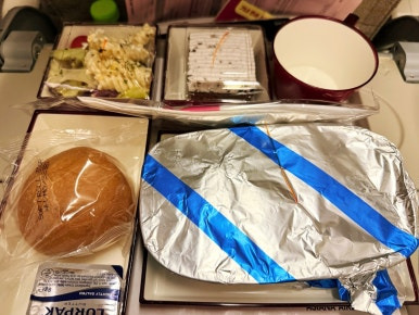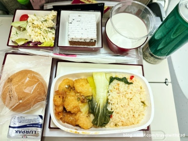 이륙 후 안정 고도에 이르니 승무원들은 바쁘게 기내식을 준비했다. 맨 뒤쪽에 앉았기에 기내식 선택권이 없었다. 새우 알레르기가 있어서 처음에는 새우가 들어있는 음식을 받는 것이 꺼려졌다. 다른 기내식을 받으려면 또 한참 걸린다고 하여 그냥 새우가 든 음식을 받았다. 그리고 새우는 아빠에게 다 드리고 나는 남음 음식만 먹었다.