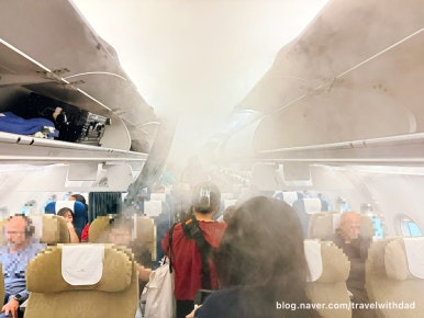 비행기를 탔는데 에어컨에서 나오는 연기 때문에 앞을 볼 수가 없었다.