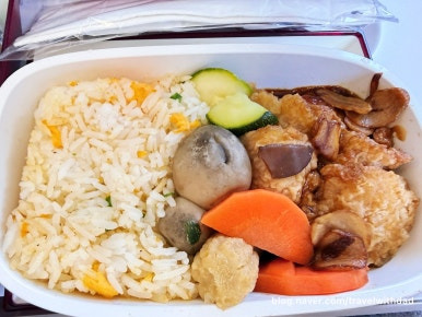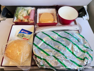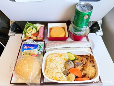 안정 고도에 이르니 기내식이 제공되었다. 맨 뒷자리에 앉다 보니 기내식 선택권이 없었다. 새우튀김과 볶음밥이었는데 새우튀김은 아빠에게 다 드리고 볶음밥만 먹었다.