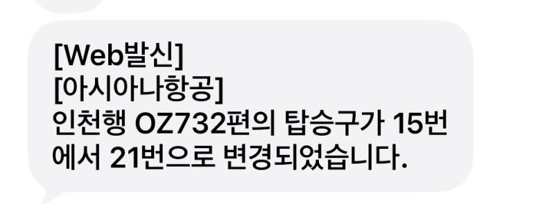 당황하고 있는데 직원이 돌아다니며 아시아나 항공 승객들에게 게이트가 바뀌었다는 것을 알려주었다.
