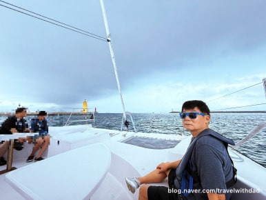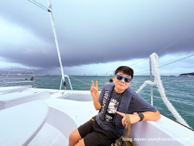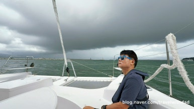 다른 사람들보다 먼저 와서 요트 앞자리에 앉을 수 있었다. 그런데 하늘이 심상치 않아 보였다.