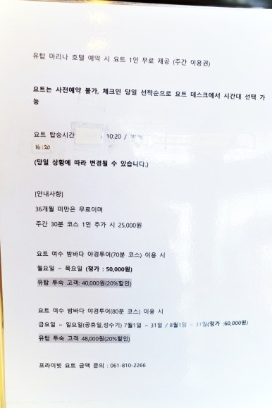 받은 쿠폰 중 하나가 1인 요트 시승권이 있었다. 그래서 요트나 타볼까 생각하고 요트 예매하는 곳으로 갔다. 쿠폰이 있어서 1인은 무료이고 다른 한 명은 추가로 25,000원 만만 내면 탈 수 있다고 해서 요트 탑승을 예약했다.
