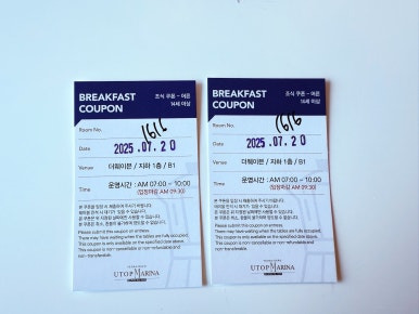 조식은 지하 1층에서 먹을 수 있는데 조식 쿠폰을 가지고 가야 했다. 잃어버릴까 봐 조식 쿠폰은 소중히 보관했다.