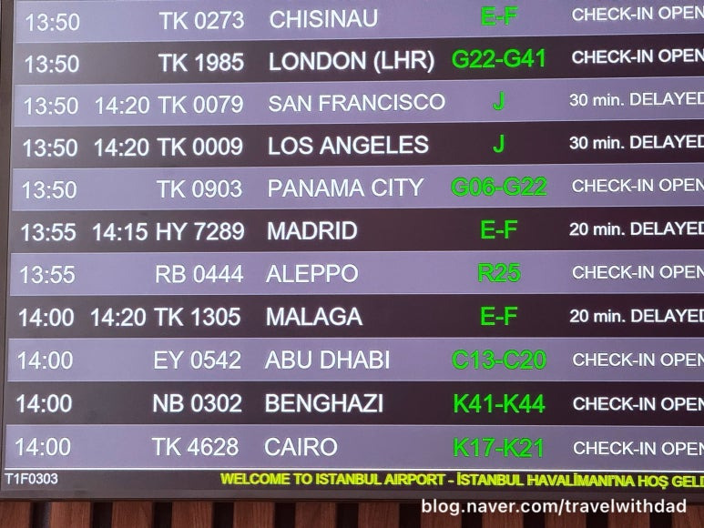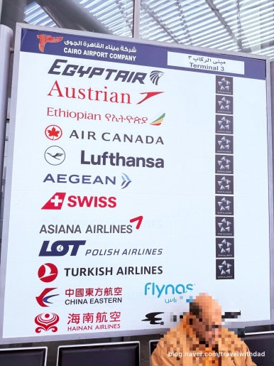 아침을 먹고 호텔에서 짐을 정리한 후 픽업 차량을 타고 공항으로 향했다. 차가 막히지 않아서 공항까지 채 한 시간이 걸리지 않아 도착할 수 있었다. 우리가 도착한 터미널은 3터미널이었다. 3터미널 대부분의 항공사는 스타얼라이언스 항공사가 차지하고 있었다. 최근까지 카이로 편을 운영했던 아시아나가 팻말에 남아 있었다.