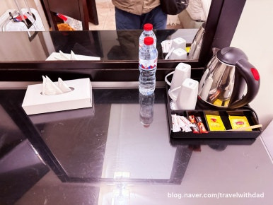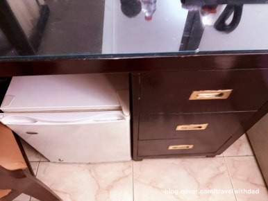 물도 제공되고 커피포트도 있었다. 그리고 작은 냉장고까지 시설은 그렇게 좋지 않았지만 지내면서 필요한 시설은 다 있었다.